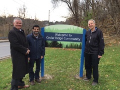 Councillor Ainslie with local residents unveiling newly installed community sign at Cedar Ridge