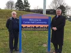 Councillor Ainslie with local resident unveiling newly installed community sign at Curran Hall