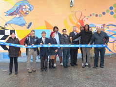 Councillor Ainslie and local youth artists at the Street Art Unveiling in partnership with East Scarborough Boys and Girls Club and G&G Electronics