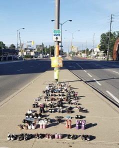 Shoes laid out at Kingston and Galloway in mourning of the 215+ children found at the Kamloops Indian Residential School in British Columbia. |